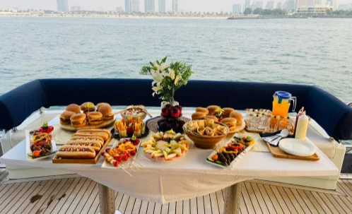 A live BBQ is prepared onboard during the Dubai Yacht Ride, offering a menu that includes burgers, hot dogs, chicken skewers, muffins, a fruit platter, and accompanying drinks.