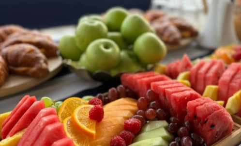 - Pastries, Croissants, Fruit platter, assorted muffins, juices, water, tea, and coffee
